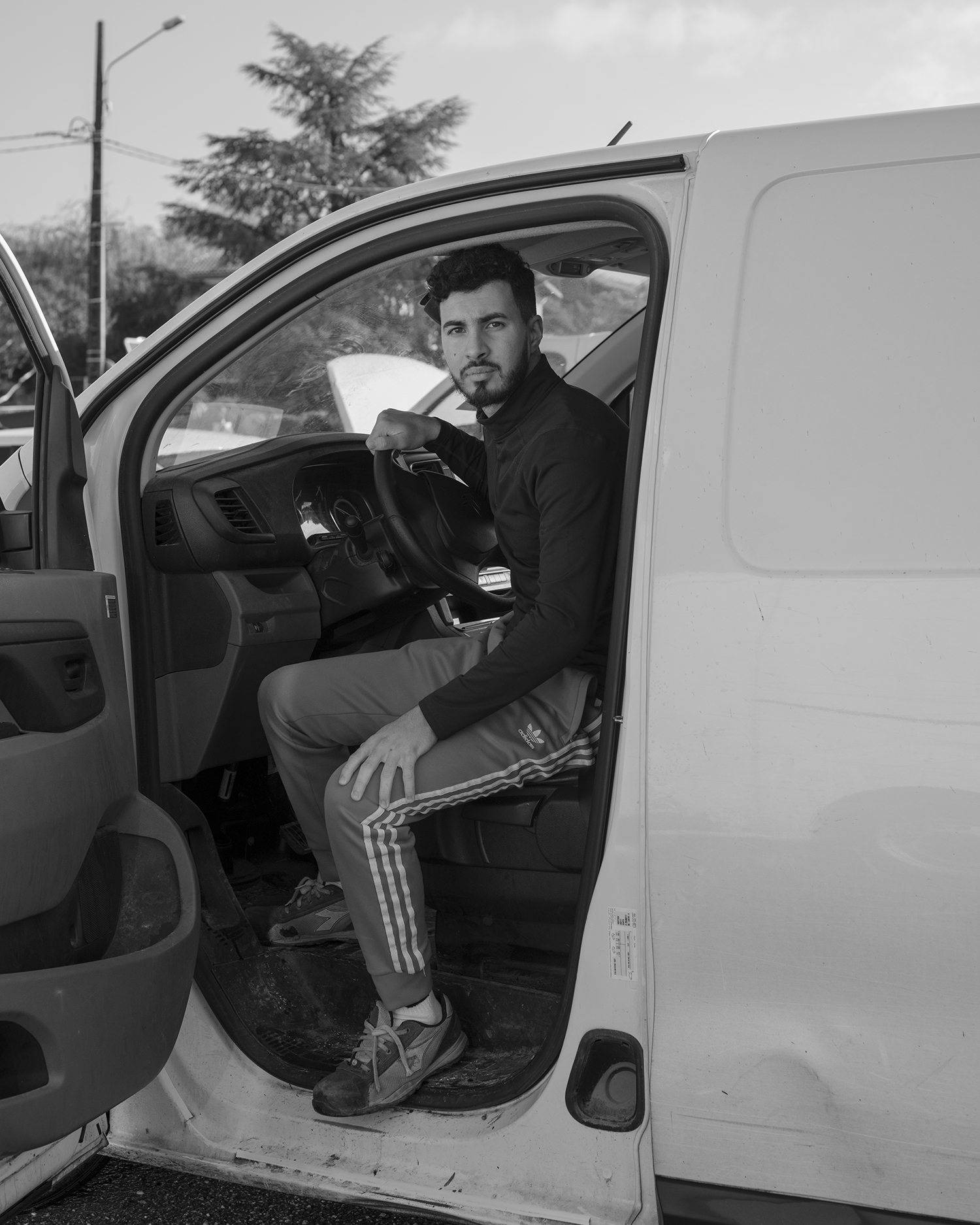 11. Redwane est chauffeur. Il est employé par un sous-traitant d’une grande entreprise de commerce en ligne. Chaque matin à 10h30, il rejoint les membres de son équipe qui se réunissent sur la place de la Commune de Paris avant d’aller charger leurs camions dans les entrepôts situés en contrebas. Bassens, 1er novembre 2023.